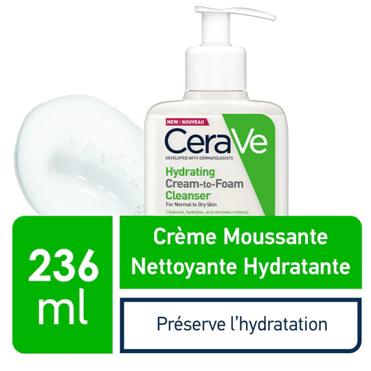 Cerave Crème Moussante Nettoyante Hydratante, démaquille les peaux normales à sèches.